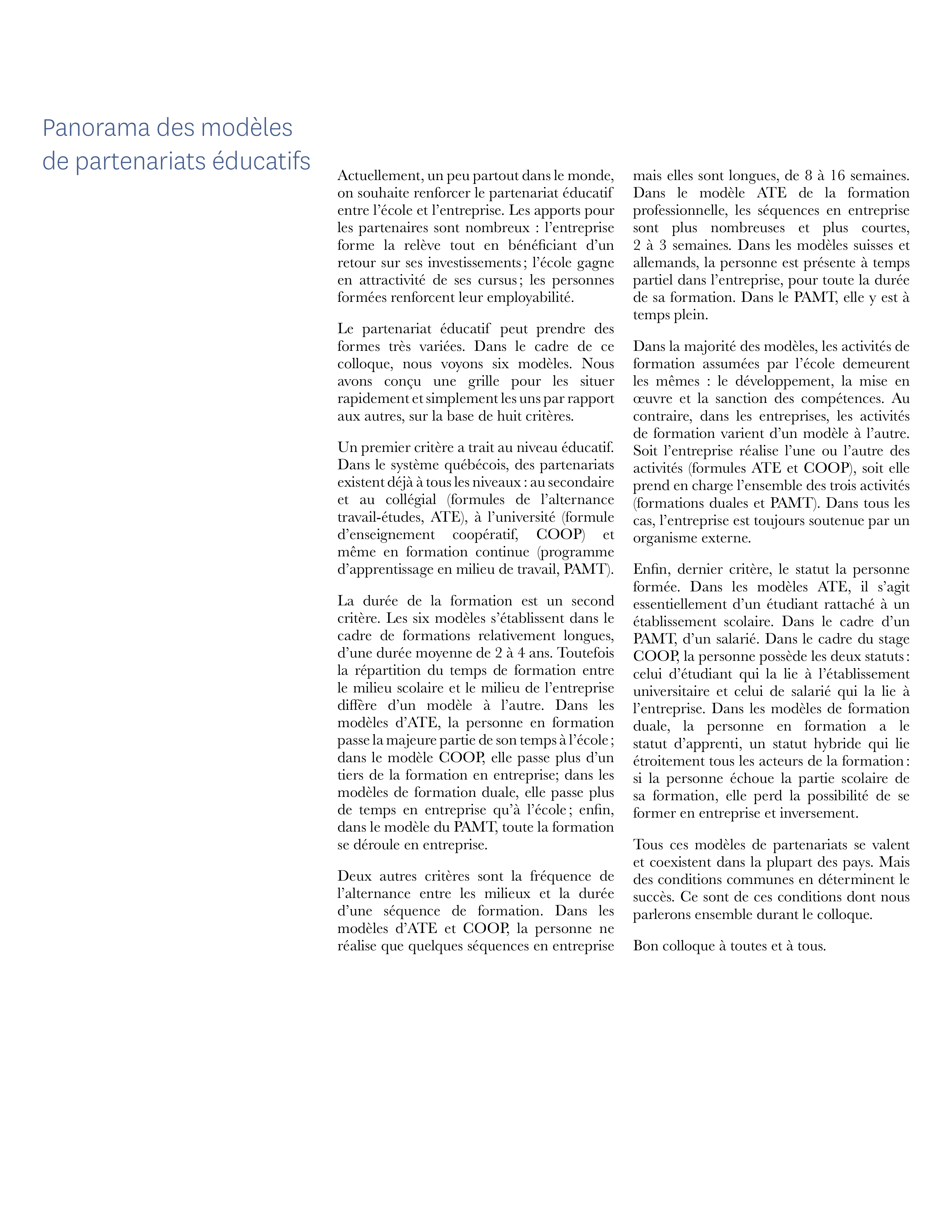 Actuellement, un peu partout dans le monde, on souhaite renforcer le partenariat éducatif entre l’école et l’entreprise. Les apports pour les partenaires sont nombreux : l’entreprise forme la relève tout en bénéficiant d’un retour sur ses investissements; l’école gagne en attractivité de ses cursus; les personnes formées renforcent leur employabilité. Le partenariat éducatif peut prendre des formes très variées.
