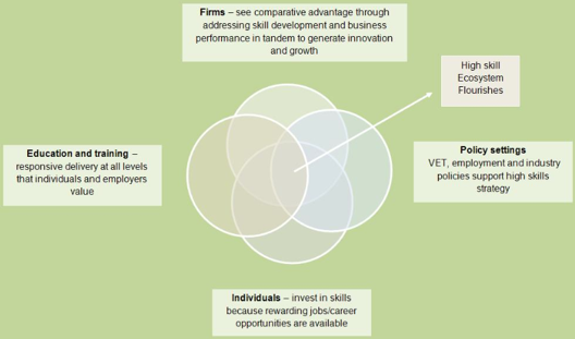 Un écosystème de compétences est ainsi le résultat d’un système en évolution constante constitué d’éléments qui influent directement ou indirectement sur le développement des compétences de la main-d’œuvre dans une industrie ou sur un territoire. L’écosystème comprend, entre autres, le système d’éducation et de formation, les entreprises, l’environnement politique et réglementaire et finalement, les individus. Voici le schéma proposé par le gouvernement australien.