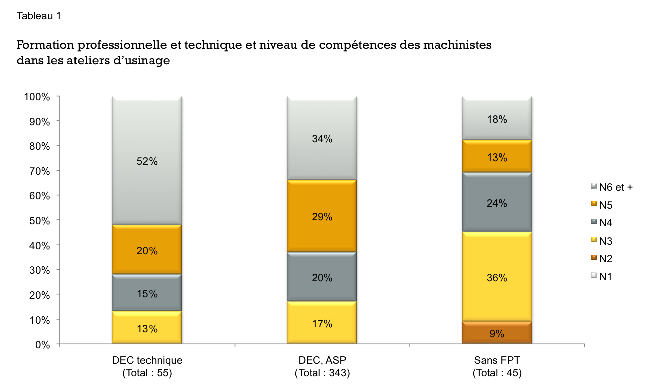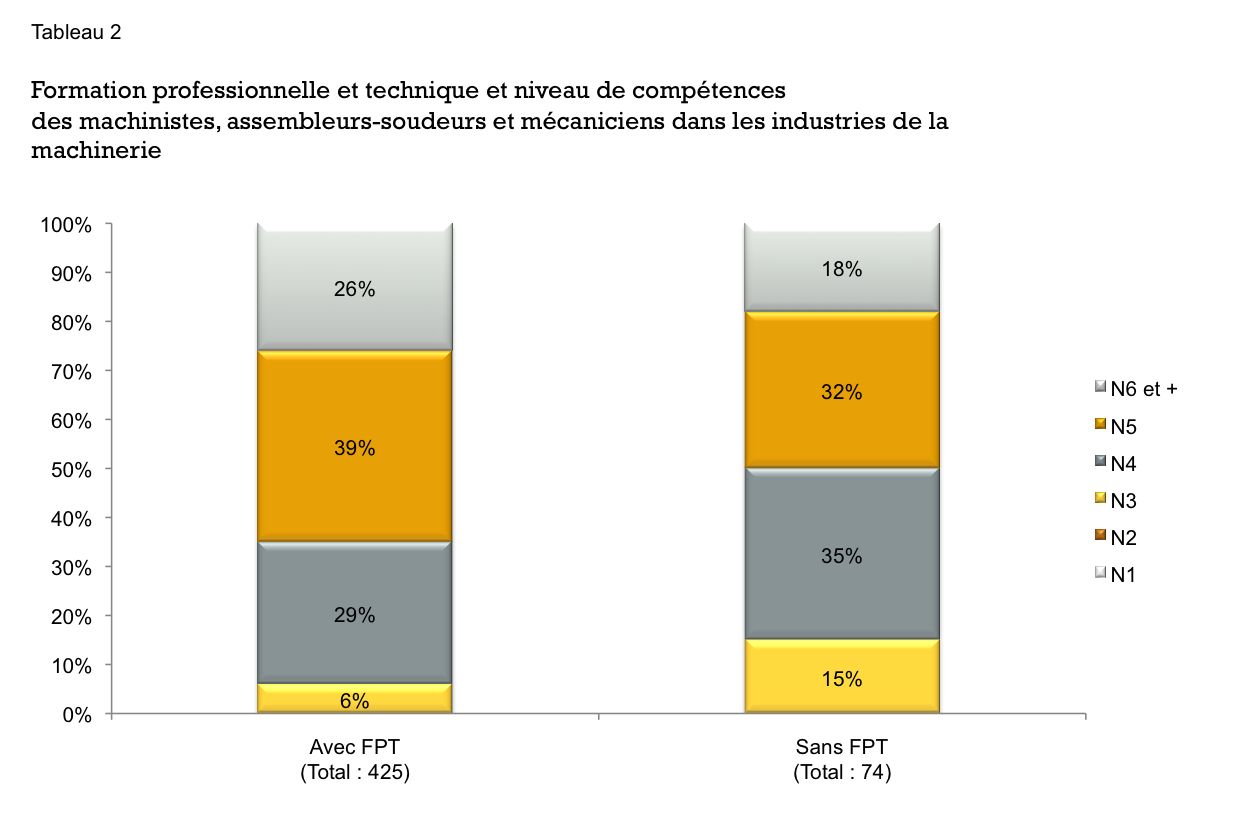 Comme nous pouvons le constater, les machinistes qui détiennent un diplôme de FPT sont nettement plus nombreux à occuper un emploi aux niveaux 5 et 6 dans les ateliers d’usinage que ceux qui n’en ont pas : 72% pour les DEC, 63% pour les DEP et ASP contre 31% des « sans formation ». Le même phénomène est observable pour les machinistes, assembleurs-soudeurs et mécaniciens dans les industries de la machinerie bien que l’écart soit moindre : 65% contre 50%.