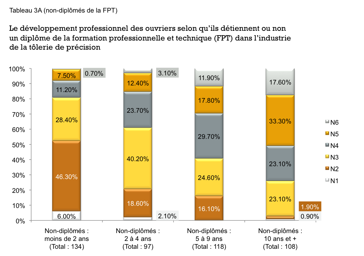 Les ouvriers des niveaux 4, 5 et 6 sont essentiels aux entreprises qui fabriquent sur mesure et sur commande. Dans ces univers industriels de complexité, les manœuvres sont rares. Et généralement, au sein d’une industrie, plus les entreprises fabriquent sur mesure, plus la proportion d’ouvriers aux niveaux 5 et 6 est élevée. Si nous appliquons cette échelle de compétences dans une entreprise de fabrication en série, nous obtenons davantage d’ouvriers aux niveaux 1, 2, 3 et 4.