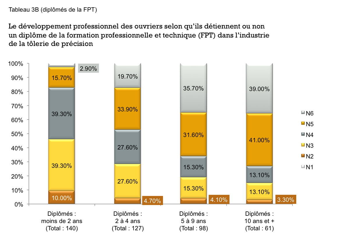 Tel que nous pouvons le constater, les diplômés de la FPT entrent aux niveaux 3 et 4 – ce qui signifie qu’ils sont mis en apprentissage sur les emplois spécialisés de l’entreprise. Ensuite, ils évoluent rapidement aux niveaux 4 et 5 et au bout de cinq ans ils ont déjà atteint les niveaux 5 et 6. Quant aux « sans diplômes », ils ne connaissent pas ce type de trajectoire. Ils entrent aux niveaux 2, 3 sur des postes de manœuvres passant d’une unité de production à l’autre. À ces niveaux, ils développent une polyvalence, mais sur les travaux élémentaires de l’entreprise qui nécessitent peu ou pas d’apprentissage (N1), moins de trois mois pour acquérir un savoir pratique, « un tour de main » (N2) ou quelques mois (N3). Ce n’est donc pas le type de polyvalence que recherchent les entreprises lorsqu’elles déplorent que leurs ouvriers ne le sont pas. À l’occasion de ces passages d’une unité à l’autre, d’une fonction de travail à l’autre, ils sont observés et les plus doués sont pressentis pour des emplois semi-spécialisés ou spécialisés aux niveaux 3 et 4. Ensuite, ils vont passer une dizaine d’années sur ces niveaux, voire même toute une carrière professionnelle. Ce n’est qu’au bout de dix ans qu’une proportion d’entre eux atteint les niveaux 5 et 6. Les diplômés de la FPT progressent donc plus rapidement et ils atteignent plus nombreux les niveaux 5 et 6 de leur métier.
