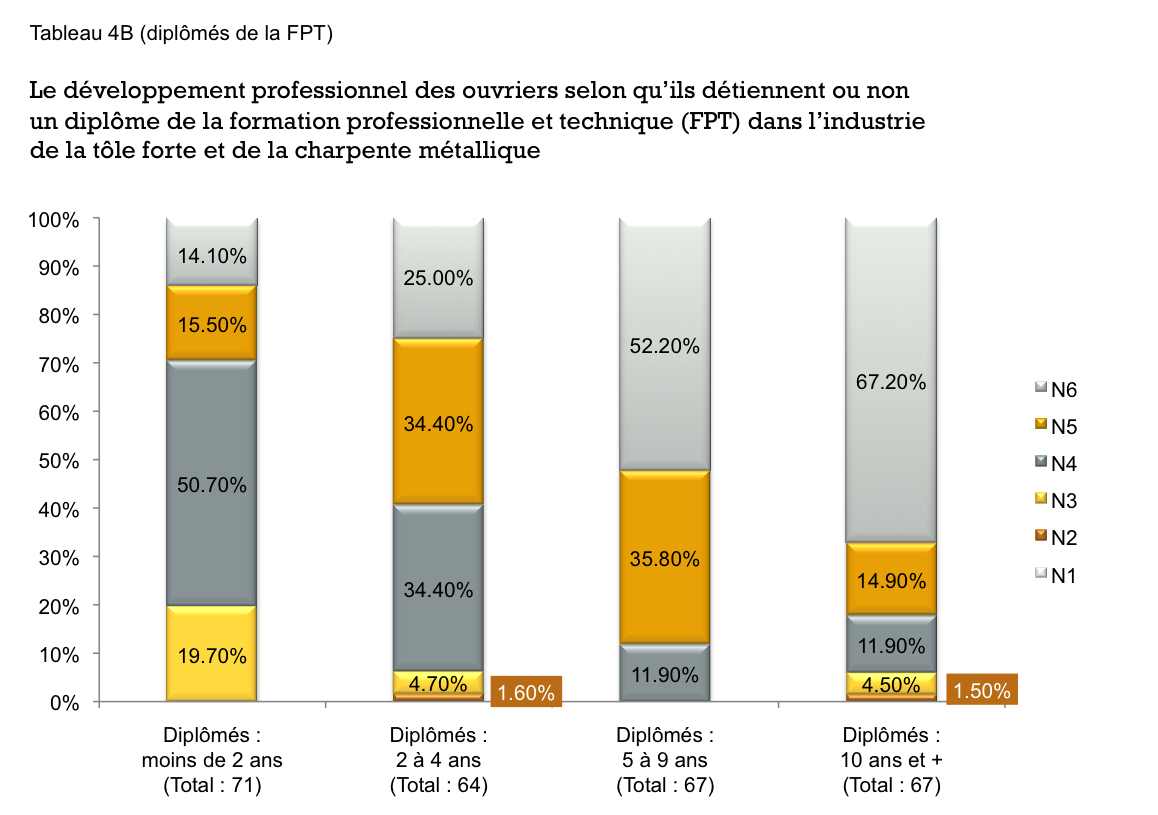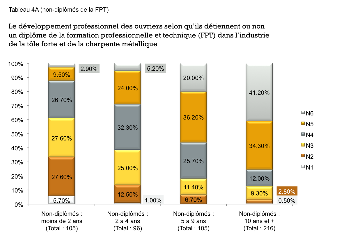 Les ouvriers de niveau 4 réalisent les travaux courants de l’entreprise. Ils partent d’un plan ou d’un bon de production et ils réalisent le travail de façon autonome. Les emplois des niveaux 4 se distinguent des précédents (N3) parce qu’ils requièrent un bon bagage de savoirs théoriques et techniques liés à l’exercice des métiers.